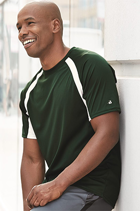 Self-fabric collar. Double-needle hem. Contrast side and sleeve panel inserts. Badger heat seal logo on left sleeve.