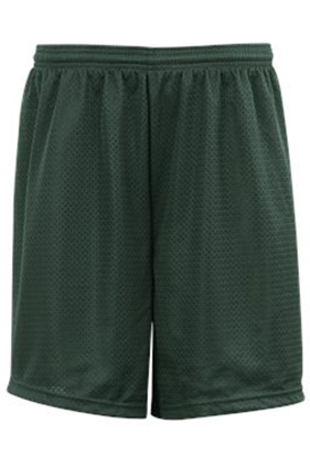 100% Polyester, 70 denier mesh with solid tricot liner. Athletic cut. Superior fit. Covered elastic waistband and drawcord. Nine-inch inseam.
