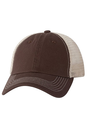 55/45 cotton/polyester. Bio-washed twill front, mesh back.