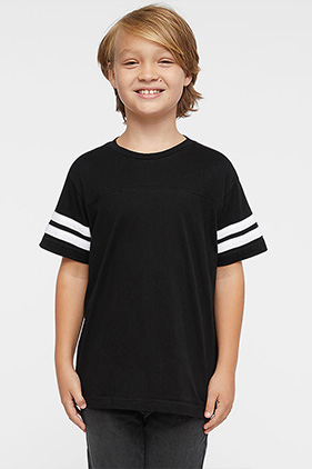 Ribbed collar. Shoulder-to-shoulder self-fabric back neck tape. Contrast topstitched self-fabric sleeve stripes. Coverstitched front and back yoke. Double needle sleeves and bottom hem. Side-seamed. Youth unisex fit. EasyTearâ„¢ label. CPSIA compliant tracking label in side-seam.