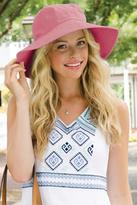 Wide 4" floppy brim for sun protection. Three-panel, unstructured crown. Breathable. Ladies silhouette. Bucket hat style and fit.