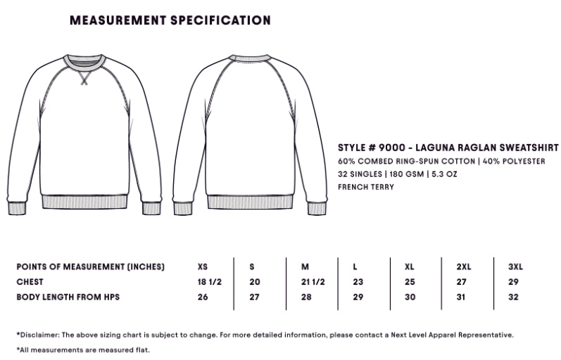 Lightweight. Pullover crew neck. Self 3/8" back neck binding. 7/8” neckband. Cross stitch at neckline. Raglan long sleeves. 2 1/2” waistband and cuff with 1x1 rib. Back neck half moon. Side-seamed. Smooth finish perfect for screen-printing and heat transfer. Regular fit. Tear away label.