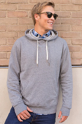 Midweight. Unlined hood. Split stitch double needle sewing. 1x1 ribbing at cuffs, waistband, and side panels. Antique nickel eyelets. Two antique nickel tipped flat drawcords (one contrast + one dtm). Media pocket and eyelet in front pocket. Thumbholes at cuffs. Twill neck tape. V notch. Supreme printability and softness. Slim unisex fit. Tear away label.