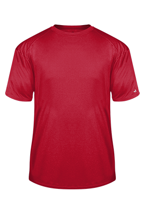 Double-needle hem. Self-fabric collar. Paneled shoulder for maximum movement. Badger heat seal logo on left sleeve.