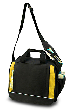Zippered top main compartment. Multi-pocket stationary organizer. Elastic pen loop under front flap and shoulder strap. Water bottle holder on side. Non-branded label/tag.