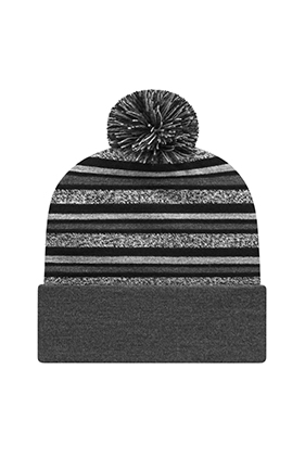 12" knit. Pom-pom on top. Solid cuff. Striped with variegated yarn.