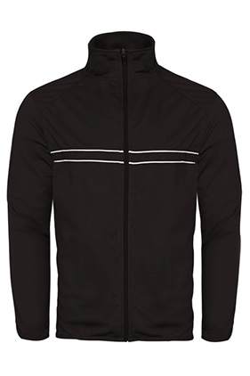 Contrasting piping on front body. Badger sport shoulder for maximum movement. Self-fabric collar with full length locking zipper. Two front zipper pockets with headset opening. Soft elastic binding on sleeve and bottom hem. Drop tail hem. Badger "B" woven loop label on bottom hem.