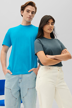 4.6 oz. (156g), 60/40 ring-spun cotton/polyester, CVC blend. Pre-shrunk. Subtle heather texture on all colors except Pitch Black and White. Made with OEKO-TEX certified low-impact dyes. Plastic waste is diverted from landfills annually by the removal of polybags from all products except color White.