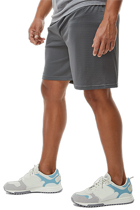 7" inseam. Double-needle hem. 1.5" Covered elastic waistband.