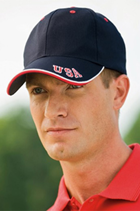Estructurado. Seis paneles. Corona media. Ojales en contraste de color, botón y visera tipo sándwich. Rojo USA bordado en la esquina izquierda de la visera. Self Fabric, cierre de velco de extremo a extremo.
