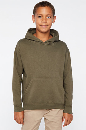 Capucha con dobladillo de doble aguja y forro de jersey. Capucha y cuello pespunteados. Cubre hombros y sisas. Puños de manga larga y banda inferior de canalé cosidos. Bolsillo canguro delantero. Mangas montadas. Con costura lateral. Ajuste unisex juvenil. Etiqueta EasyTear™. Etiqueta de seguimiento compatible con CPSIA en la costura lateral.