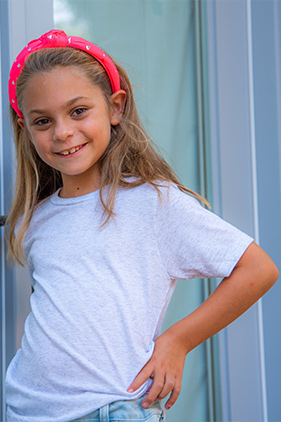 Cuello engastado canalé 1x1 con punto cubre delantero. Diseñado para niñas de 3/4 a 14/16. Cuello redondo. Mangas con dobladillo. Con costura lateral. Dobladillo inferior recto. Preparado para imprimir. Ajuste clásico. Etiqueta desprendible.