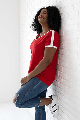 Cuello acanalado en contraste y aberturas en las mangas. Cinta en la parte trasera del cuello del mismo tejido. Rayas de hombro del mismo tejido con pespuntes en contraste. Dobladillo inferior con doble aguja. Costuras laterales. Ajuste de figura completa con curvas para mujer. Etiqueta EasyTear™.