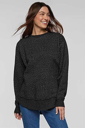 Cuello acanalado. Cinta de punto en la parte trasera del cuello. Parche del casillero trasero. Construcción de hombros caídos. Puños y banda inferior de canalé. Costura sin rematar en puños y banda inferior. Silueta de longitud más larga con dobladillo inferior curvado. Costuras laterales. Largo de la túnica. Las damas se relajaron un poco sobredimensionadas. Etiqueta EasyTear™.