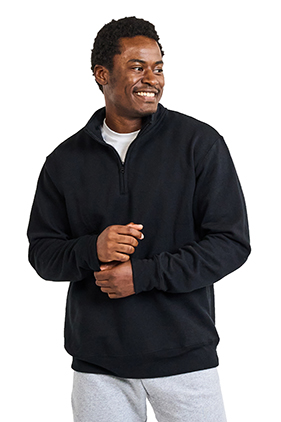 Cuello tipo cadete forrado con la misma tela. Cremallera de un cuarto con solapa. Canalé 1x1 con elastano para mayor elasticidad y recuperación. Costuras de doble aguja en hombros, sisas, cintura y puños. Cuerpo sin costuras. Corte clásico. Etiqueta negra reciclada de alto rendimiento que se retira fácilmente.