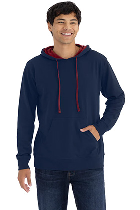 Peso medio. Ribete en contraste del cuello trasero de 3/8". Capucha forrada en jersey con color contrastante o a juego. Cordón plano a juego con ojales metálicos. Bolsillo tipo canguro. Puños y cintura de canalé 1x1. Acabado liso perfecto para serigrafía y transferencia de calor. Ajuste clásico. Desgarro etiqueta de distancia.