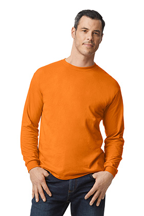 5,5 onzas (187 g), 50/50 algodón/poliéster estadounidense, 20 individuales, jersey. Inencogible. Absorbe la humedad. Safety Green: cumple con los estándares de alta visibilidad ANSI - ISEA 107. El contenido de fibra varía según el color. Orgulloso miembro del U.S. Cotton Trust Protocol. Elaborado con tintes de bajo impacto certificados OEKO-TEX.