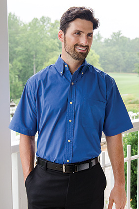 Button down collar and left chest pocket with pencil slot. Center back pleat. Full button front with woodtone buttons.