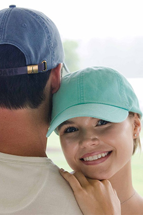 Enzyme-washed for slight distressed look. Six-panel. Unstructured. Low-profile. Multiple rows of stitching on bill and self-fabric sweatband. Dyed to match cotton taping. Sustainable manufacturing. Adjustable Dad hat for men and women. Tuck-away leather back strap with antiqued brass buckle and grommet. Adam's logo on leather strap.