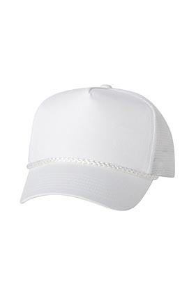 80% polyester/20% cotton five-panel trucker cap. Mesh back. Structured. Mid-profile. Five-panel with Braid, Pre-curved visor, Plastic tab closure.