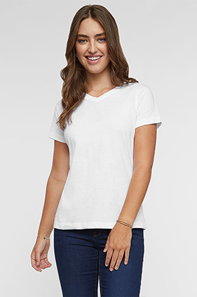Topstitched ribbed v-neck collar. Self-fabric back neck tape. Double needle sleeves and bottom hem. Side-seamed. Classic, feminine relaxed fit. EasyTearâ„¢ label.