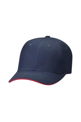 65% polyester/35% cotton sandwich cap. Structured, mid-profile. Six-panel, Pre-curved sandwich visor. Hook and Loop Closure.