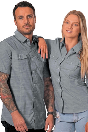 Lightweight. Two flap pockets with button closure. Stitched yoke. Hemmed sleeves and bottom. Red has contrast inner collar.