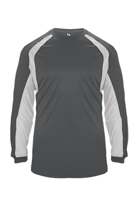 Contrast side and sleeve panel inserts. Double-needle hem. Self-fabric collar and cuffs. Badger heat seal logo on left sleeve.
