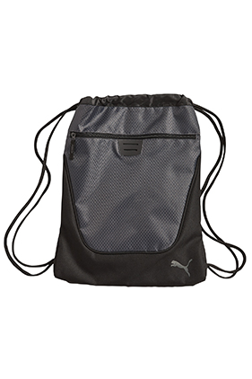 Nylon rope cinch closure. Front zippered pocket. Zippered interior pocket.