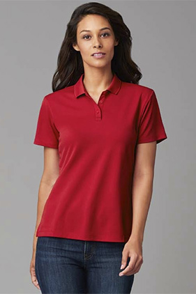 65% polyester/35% cotton, 6.2 ounce women's piqué polo. Soil Release. Anti-microbial. Contoured welt collar. Clean finished reversed placket with single needle topstitch. 3 color-matched buttons. Rolled forward topstitched shoulder. Side seam with self fabric face side vents. Double needle sleeve and bottom hems. Modern classic fit. Woven label.
