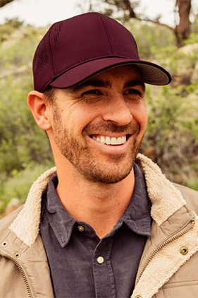 Perforated laser cut front. Side and back panels. Structured. Six-panel. Mid-profile with memory structure. Slight-curved buoyant visor board, heather charcoal undervisor. Imperial reflective script woven label. Rubberized hook and loop closure.