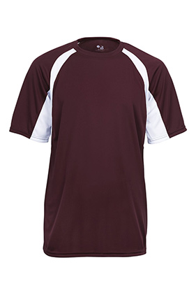 Contrast side and sleeve panel inserts. Double-needle hem. Self-fabric collar. Badger heat seal logo on left sleeve.