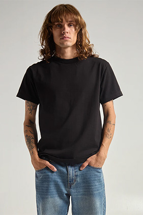 Midweight. 1" neck ribbing. Densely knit. Regular width and length. Retail true to size fit. Tear away label.