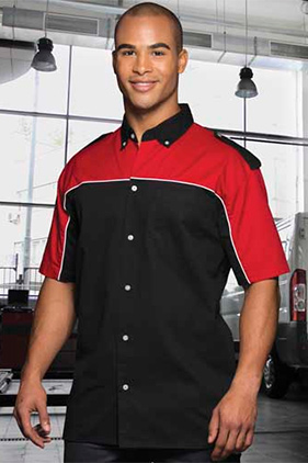 55% cotton/45% polyester 6.8 ounce shirt with button-down collar, shoulder epaulets and left chest pocket. Color-block design. White piping on front and sides. Hemmed sleeves and finished bottom hem.