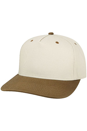 Structured. Five-panel. Mid-profile. Slight curved bill. Contrast eyelets and button. Snapback closure.