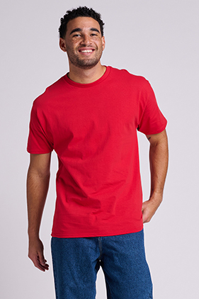 4,7 onzas. (159 g), 100 % algodón estadounidense, jersey, 28 individuales. Inencogible. Importado. Athletic Heather: CVC 90/10 algodón/poliéster. Fresno: CVC 98/2 algodón/poliéster. Brezos de colores: CVC 60/40 algodón/poliéster. Rosa neón, colores de seguridad: CVC 60/40 algodón/poliéster.
