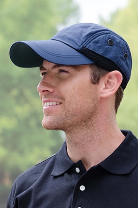 Four panel, low profile cap. Extra long visor for sun protection. Mesh side panels and screen metal eyelets for extra breathability. Flexible nylon webbing outside Velcro closure. Metal clip and cord system to attach to collar. Adams exclusive Cool-Crown mesh lining.