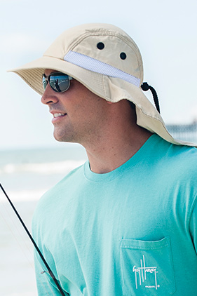 Four panel, low profile crown. Neck cape with patented zipper pocket protects neck and ears. Mesh panels and large screened metal eyelets for better ventilation. Adams exclusive Cool-Crown mesh lining. Metal clip and cord to attach to collar. 3 1/2 foam-covered visor ensures flotation. Terry cloth sweatband.
