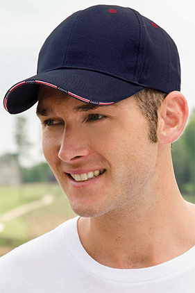 Six panel, mid-crown structured, pre-curved visor. Navy crown with contrast red eyelets and button, stars and stripes sandwich visor. USA flag label at back arch. Self-fabric hook and loop closure.
