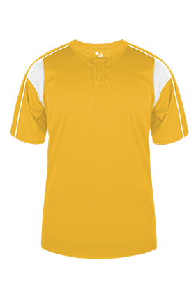 100% polyester moisture management performance fabric. Badger heat seal logo on left sleeve. Contrasting panel inserts. Two button placket. Double-needle hem.