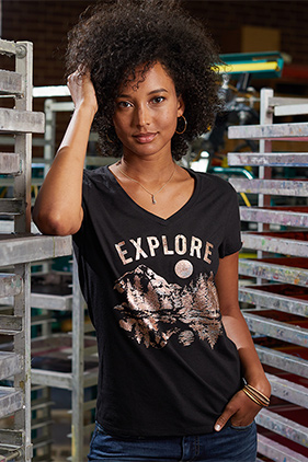 Lightweight. Double-needle sleeve and bottom hems. Self-fabric neck tape. Stylish mitered V-neck. Side-seamed. Clean Canvas technology for superior printability. Contoured for modern feminine fit. Tear away label.