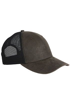 65% polyester/33% cotton/2% polyurethane faux waxy trucker hat. Structured, mid-profile, six-panel. Pre-curved visor. Plastic tab closure.