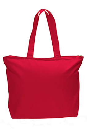 Large main compartment with zippered closure. Inside zippered flap pouch pocket. 25" self-fabric handles, 11" drop.