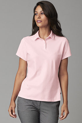 95% cotton/5% spandex, 5.3 ounce women's polo. UPF 30+ (white is not applicable). Self fabric collar. Clean finished reversed placket with single needle topstitch. Color-matched trim in the inside of placket. 4 color-matched buttons. Rolled forward topstitched shoulder. Side seam with self fabric face side vents. Decorative logo side tab on left side seam. Double needle sleeve and bottom hems. Stretch modern classic fit. Woven label.