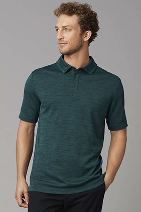 100% polyester, 5.3 ounce heather pique polo. Wicking properties. UPF 50+. Self fabric collar. Clean finished placket with reinforced X stitch bottom box. 3 color-matched buttons. Rolled forward topstitched shoulder. Side seam with self fabric face side vents. 1" extended back tail. Decorative logo side tab on left side seam. Double needle sleeve and bottom hems. Modern classic fit. Woven label