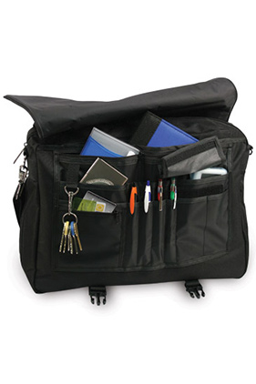 Single zippered sleeve pocket on flap 13" W x 8" H. Strap with upgraded black nickel finish hardware. Full length sleeve pocket on back. Key clip and organizer under flap. Non-branded label/tag.