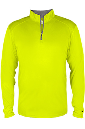 Contrast zipper and inner collar. Self-fabric collar with 6" locking zipper. Paneled shoulder. Badger heat seal logo on left sleeve.