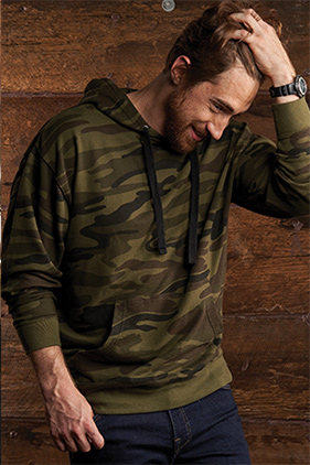 6.8 oz. enzyme washed fleece. Black Camo is 70/30 cotton/polyester. Green Camo is 100% cotton.