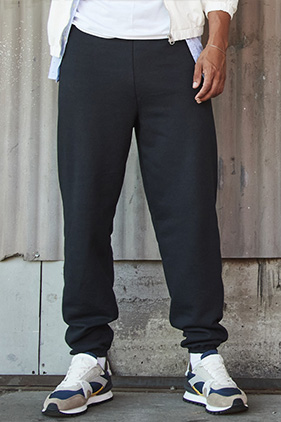 Two-needle covered elastic waistband with inside drawcord. No side seams or pockets. Elastic bottom leg openings with two-needle coverstitching. High stitch density for a smooth printing canvas. Classic fit. Tear away label.